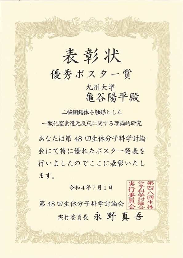 木原直樹のポスター発表「ドーパミン–β–モノオキシゲナーゼの触媒機構に関する理論的研究」が、日本化学会西日本大会においてポスター賞を受賞しました。