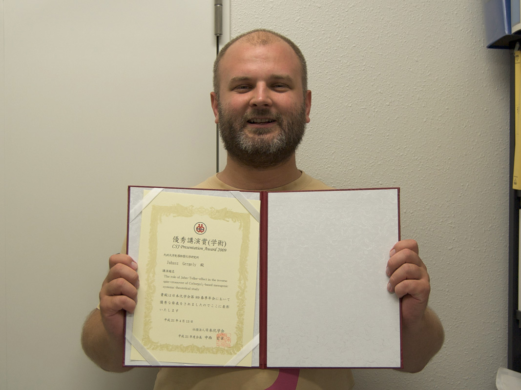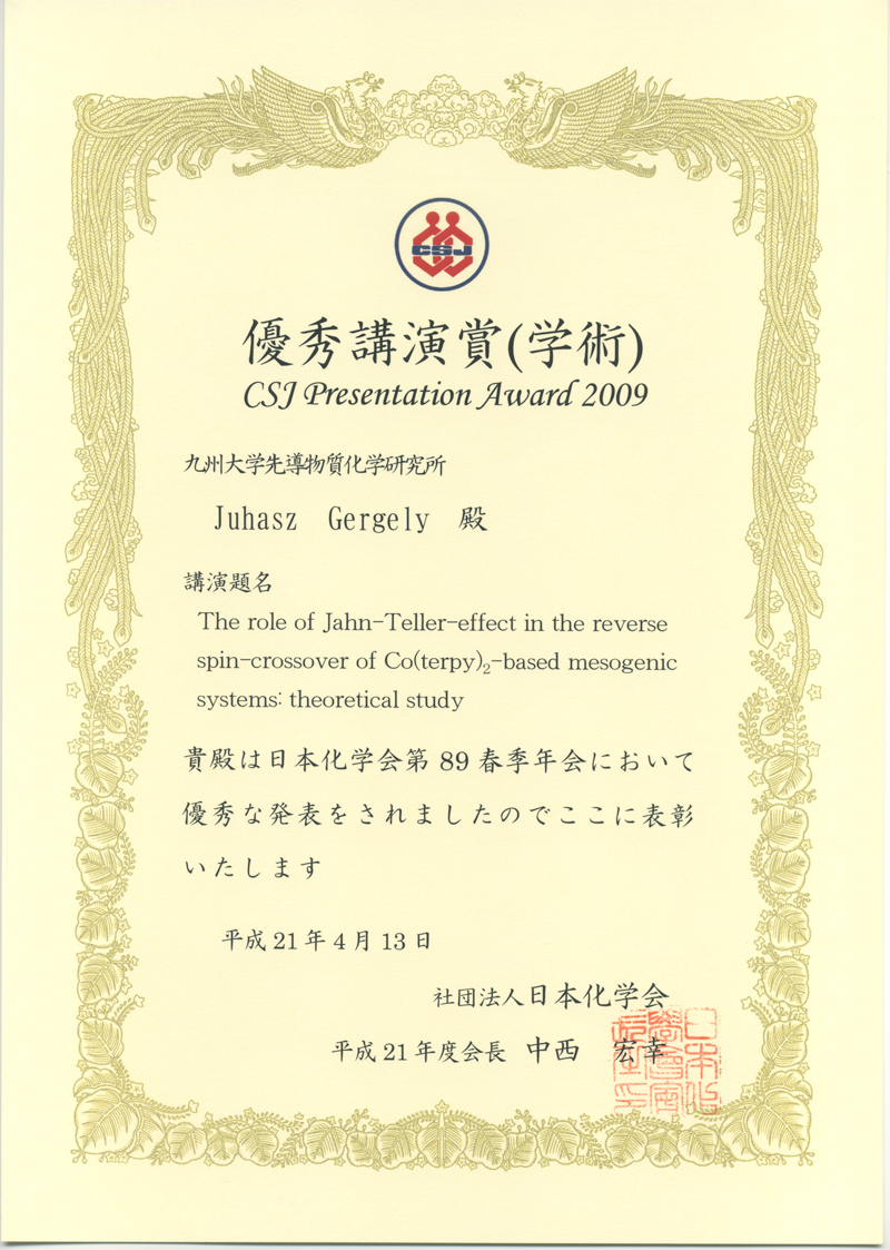 Gergely Juhász博士の口頭発表「The role of Jahn–Teller–effect in the reverse spin–crossover of Co(terpy)2–based mesogenic systems: theoretical study」が、日本化学会第89春季年会において優秀講演賞を受賞しました。