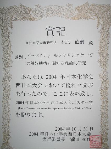 日本化学会西日本大会ポスター賞受賞 (2004年)