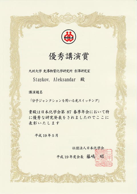 Aleksander Staykov博士の口頭発表「分子ジャンクションを用いる光スイッチング」が、日本化学会第87春季年会において優秀講演賞を受賞しました。